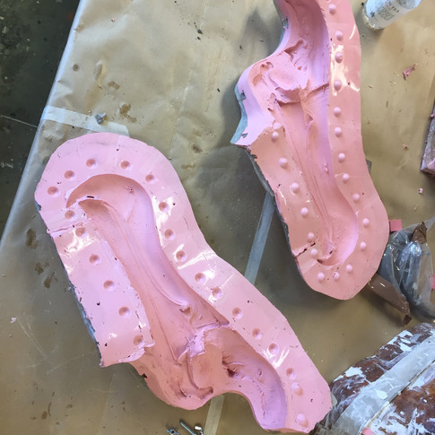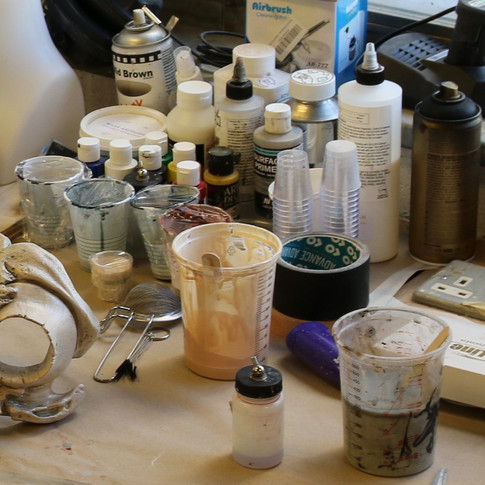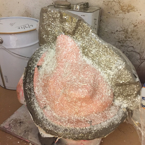 The masks were moulded in silicon with fibreglass jackets. All the moulds were made in multiple (bolt together) pieces so they released easily from the complex sculptures. The moulds were partitioned using a combination of Plastishim and clay walls.